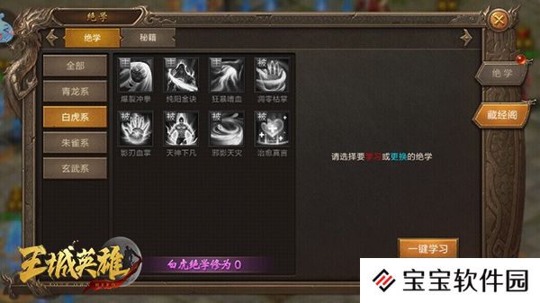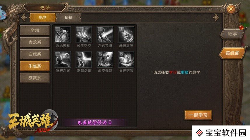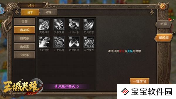 绝学分为4种,青龙,白虎,朱雀,玄武, 每种有8个技能供大家选择(目前有部分技能按照官方意思是比较厉害所以爆率很低)450级可装备3个绝学,500级可装备4个绝学。主动技能只能装备2个,被动技能可以装备4个。
