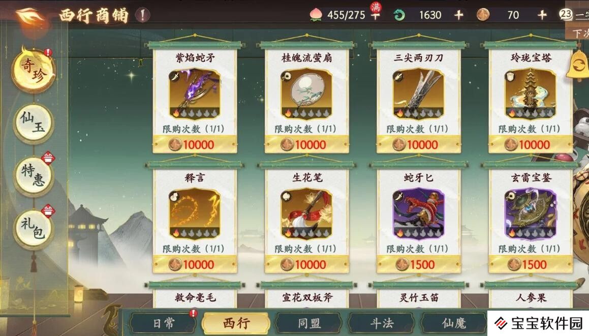 西行商铺可兑换角色【专属法宝】和【法宝材料】。每周法宝材料【觅宝钱】和【法宝源蕴】可优先兑换完。橙色法宝和紫色法宝需结合自身阵容兑换,按自身需求进行即可,无明确优先兑换哪个之说,如阵容有托塔天王,需玲珑宝塔可优先兑换【玲珑宝塔】,需输出法宝可优先兑换【三尖两刃】,前期橙色法宝较难兑换,可先兑换紫色法宝过渡。