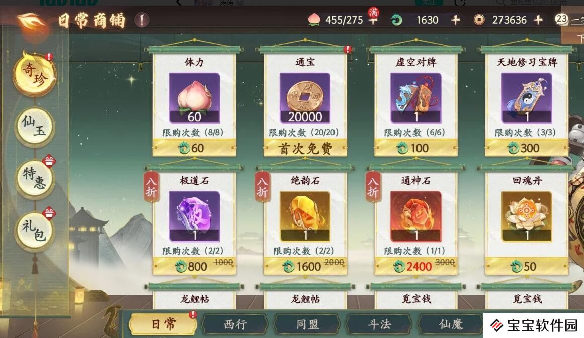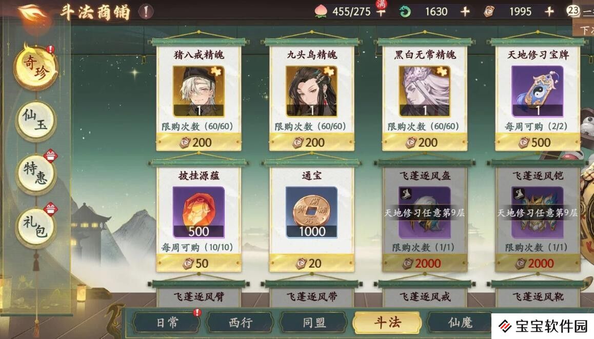 斗法商铺同样每月刷新一次。优先兑换每周限购的【天地宝牌】和【装备强化材料】。然后根据阵容需求兑换角色精魄,内测共有 3 个角色:猪八戒、九头鸟、****,这 3 个角色中后期就业率都很高。九头鸟和****除抽卡外获取渠道少,可优先兑换,白板九头鸟当破军工具人也很香。橙装我们通关 13 层后也不缺橙色装备,且套装效果各品质都一样,装备重要的是词条。