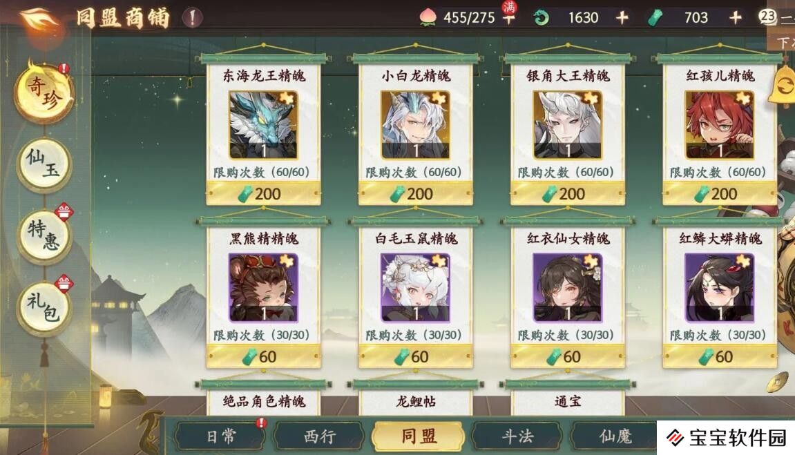 同盟商店每月刷新一次,商店福利不错,可兑换橙色角色。优先考虑兑换橙色角色,目前内测共有 4 个橙色角色:东海龙王、小白龙、银角大王、红孩儿,最值得兑换的是龙王和银角,狮子推荐优先兑换龙王,这是毕业级坦克且实用性高,银角也不错。小白龙和红孩儿强度中规中矩。其次可考虑兑换厉害的紫色角色:黑熊精和白毛玉鼠,这两个对平民玩家来说可用到后期。最后兑换每周的【龙鲤帖】。【绝品角色精魄】和【通宝】不推荐兑换