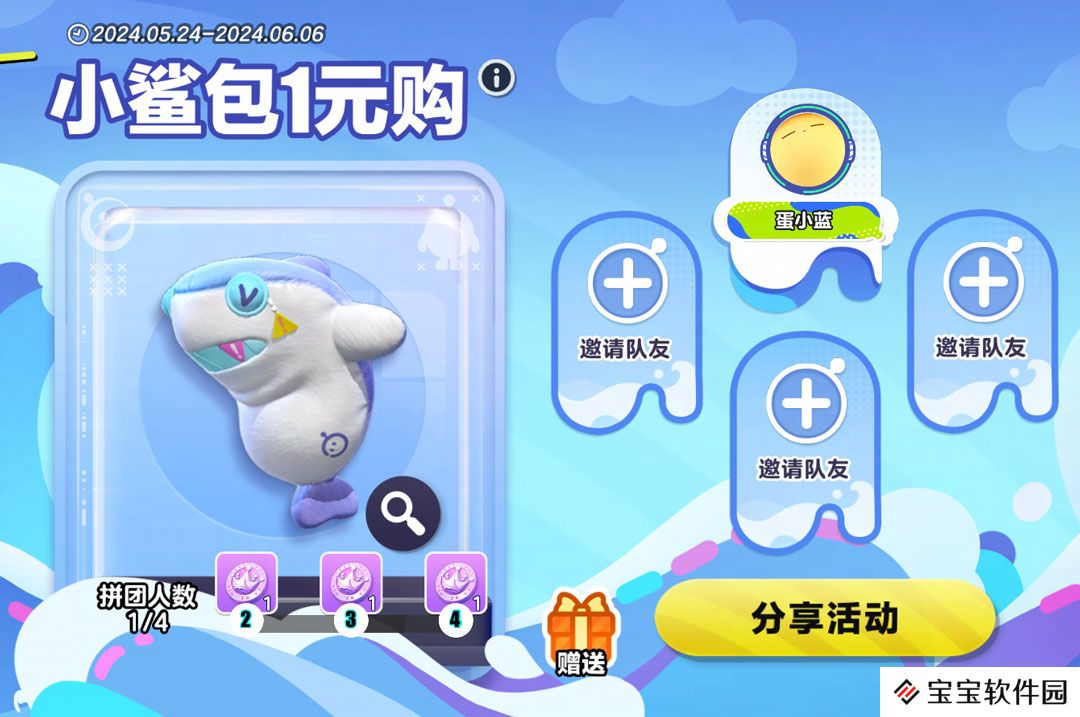听闻蛋仔踏上了新的冒险旅途,老朋友鲨莉娃将私藏分享出来,希望能代替她陪伴蛋仔。5月24日至,“小鲨包1元购”活动开启,活动期间仅需1元即可购买典藏背饰“小鲨包”,完成购买的蛋仔们可自行拼团,成功拼团4人后即可领取至多3枚彩虹币好礼!