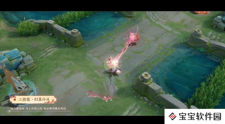 二技能·幻翼仆从 芈月操纵戏灵链接目标,链条呈镂空云纹并伴随星点点缀。成功链接时,芈月身上浮现时隐时现的云纹,身后地面镌刻桃色花纹。