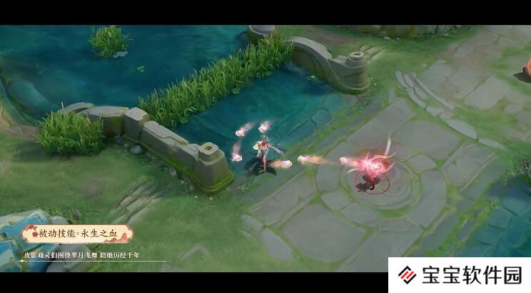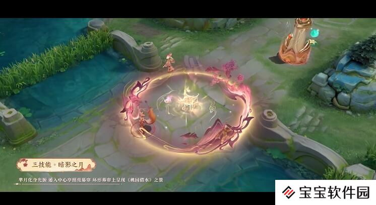 三技能·暗影之月 芈月化身光源,遁入中心亭照亮幕帘,环形幕帘上呈现《桃园借水》之景,桃树山峦环绕,两只活灵活现的皮影小人又演绎起那段经典故事。