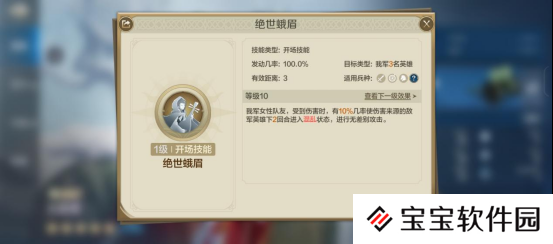 她的自带技能为“绝世蛾眉”,满级效果如下: