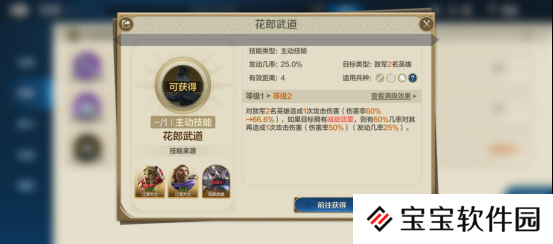 主动技能,发动几率25%,有效距离4,对敌军2名英雄造成一次60%(满级120%)的伤害,若目标具有减益效果,则60%几率对其再造成一次50%的伤害。