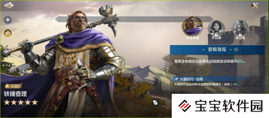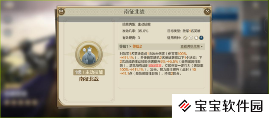 自带技能是铁锤查理的核心,“南征北战”对一名敌军英雄造成一次100%伤害率的伤害【满级200%】后,并使我军随机两名英雄获得以下1个状态:下2次攻击造成的主动技能伤害提升5%【满级10%】(受防御属性影响)、清除所有战时减益效果,立即恢复100%恢复率的兵力【满级200%】、攻击、智力属性提升(战时)10点【满级20点】(受防御属性影响),皆持续二回合。